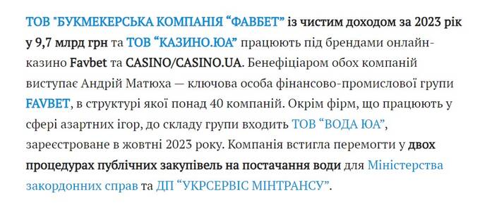 Хоча про те, що Андрій Матюха має російський паспорт, а його казино Фабвет працює в Росії та на окупованих територіях, пишуть ще з моменту легалізації азартних ігор, на його діяльності це якщо й відбивається, то лише на краще. Так, за даними сервісу YouControl, торік ТОВ «Букмекерська контора Фавбет» заробила майже 10 мільярдів гривень.